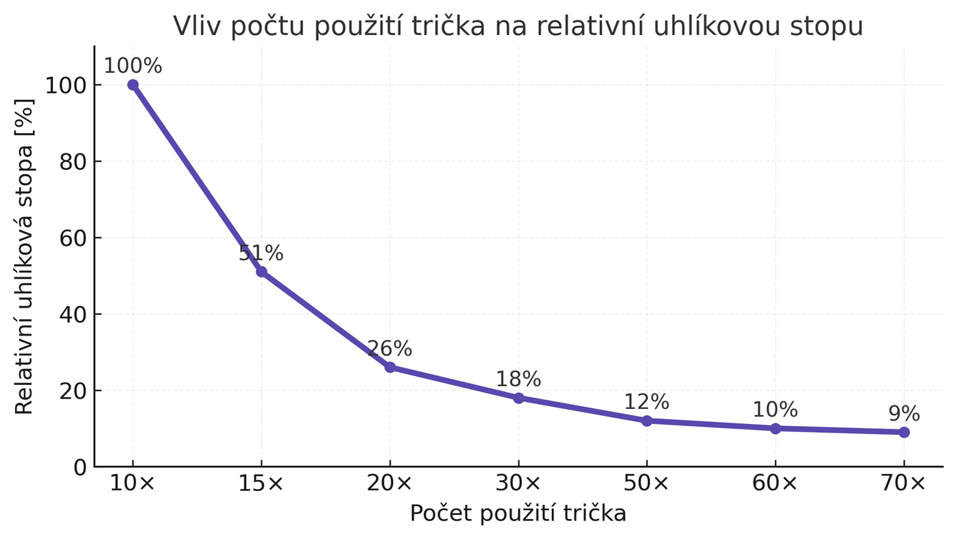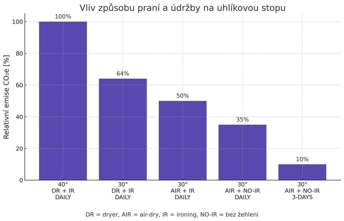 Hodnocení životního cyklu (LCA – life cycle analysis) ukazuje, že největší ekologická zátěž nevzniká při výrobě oděvu, ale během jeho používání. Praní, sušení a žehlení mohou tvořit dominantní část uhlíkové stopy. Snížení teploty praní, sušení na vzduchu a omezení žehlení dokáže emise výrazně snížit; ještě větší vliv má však samotná délka používání. Tričko nošené 50krát má téměř o 90 % nižší uhlíkovou stopu než tričko vyřazené po pěti použitích. LCA tak potvrzuje, že ekologické je především to, co používáme dlouho.